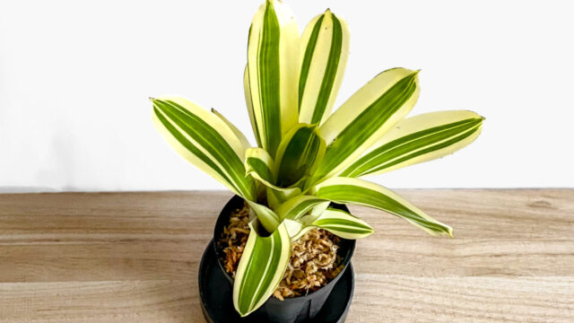前に投稿した記事に続き、今回もタンクブロメリアの植え替え記事です。今回植え替えたのはいわゆるタンクブロメリアの一種、エクメア属(別名サンゴアナナス属)ガモセパラの斑入り園芸種”ラッキーストライプス”。覆輪にクリーム色っぽい斑が入る美しい品種です。
